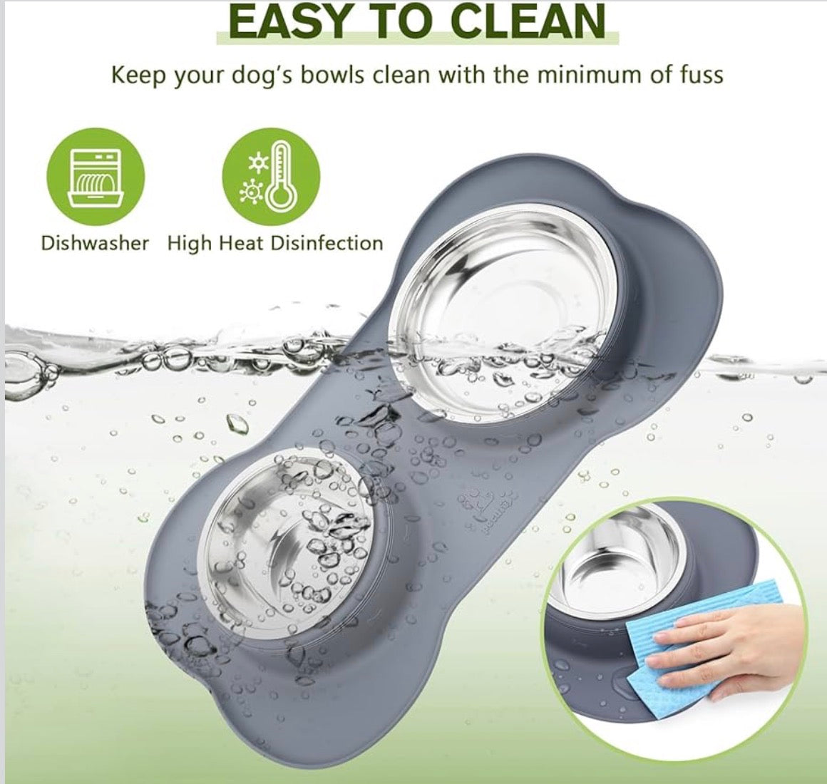 Pecute Dog Bowls – Large Stainless Steel Double Bowl Set with a Non-Slip, Non-Spill Silicone Mat Tray for Medium Dogs, Grey